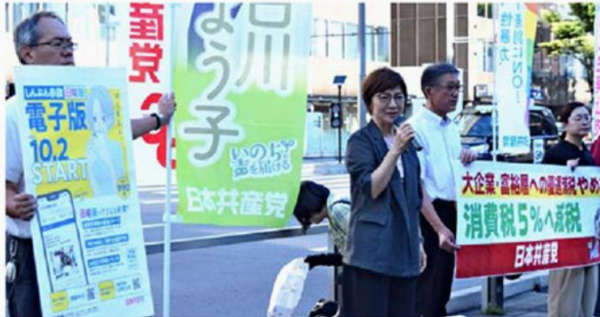 メンバーらは、「消費税5%へ減税」などと書かれた横断幕や政策プラスターを掲げ、アピール。公約に掲げた消費税減税やインボイス制度の廃止実現のため、みなさんと共に奮闘していくとのべ、10月からスタートする電子版「しんぶん赤旗」日曜版の購読を呼びかけました。