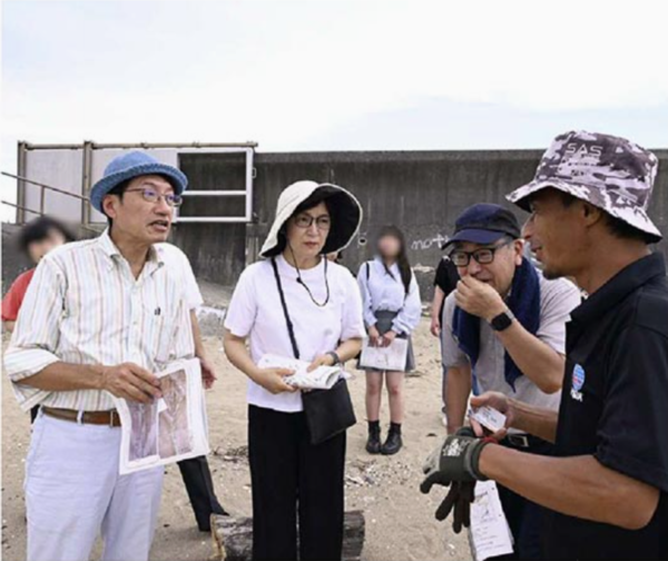 田村、白川の両氏は、刻む会と市民の募金で建立された追悼ひろばと炭鉱の坑口、海面に突き出るピーヤ(排気・排水筒)が見える床波海岸を訪問。潜水調査を支援する藤本一規県議、宇部市の時田洋輔、浅田徹の両市議から説明を受け、地元ダイバーの戸田政巳さんに坑道内の状況や国への要望を聞きました。