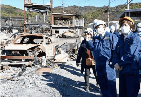 小池氏は火災現場も調査。現場には、まだ焼け焦げたにおいが残り、針やオモリの工場跡には、製造機械の残骸の痛々しい姿が。一面に焼け落ちた家屋のがれきが広がり、倒壊していない家屋にも「危険」と書かれた貼り紙や「外装材の落下注意」と書かれた貼り紙が貼られている家屋がありました。