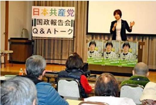 高知県の日本共産党東部地区委員会は白川容子参院議員を迎えて7日、香美市でつどいを開きました。会場いっぱいの参加で、白川氏の臨場感あふれる国会報告に拍手やどよめきが起き、高市政権の悪政を許さない熱気にあふれました。