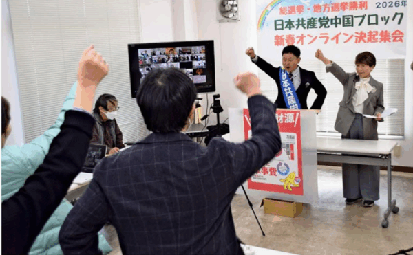 総選挙・地方選勝利で希望を開く政治への転換をめざし、日本共産党中国ブロックは13日、オンラインで新春決起集会を開きました。大平よしのぶ衆院中国比例候補が議席奪還の決意を表明し、仁比聡平、白川容子両参院議員があいさつ。5県の代表が発言し、通常国会冒頭解散で超短期決戦となる見込みの総選挙必勝へ奮闘を誓い合いました。
