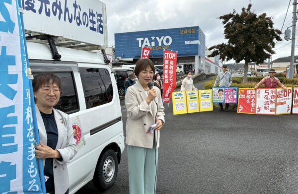 日本共産党の白川容子参院議員は22日、天草市議選(3月22日告示、29日投票)をたたかう浜崎よしあき、みのだよう子両議院(ともに現)の応援のため同市に駆けつけて街頭演説しました。定数が2議席削減され激戦が予想される同市議選で、現有2議席確保に支援を呼びかけました。