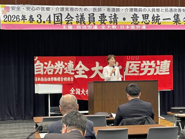 日本医療労働組合連合会(日本医労連)、日本自治体労働組合総連合(自治労連)、全国大学高専教職員組合(全大教)の医療3単産は4日、国会内外で、夜勤規制・大幅増員、ケア労働者の大幅賃上げ実現を求める中央行動を実施し、集会、国会議員要請、財務省前行動に取り組みました。